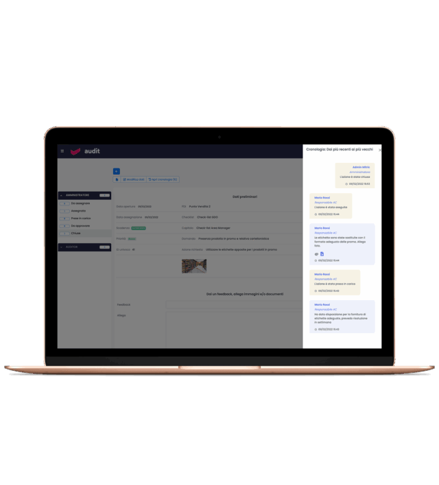 Audit controlla l’avanzamento di ogni singola azione correttiva, invia promemoria se vicino alla scadenza non è stata eseguita ed invia alert in caso di ritardi informando tempestivamente l’amministratore e il responsabile della segnalazione.