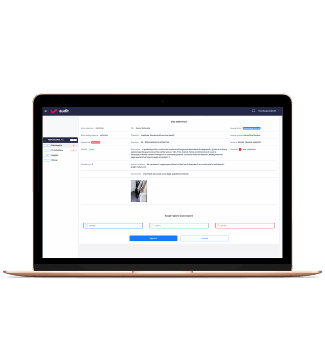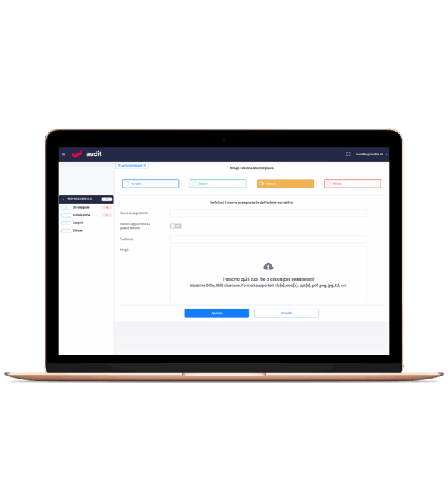 Audit distingue tra presa in carico di una azione, esecuzione o rifiuto e permette a responsabile dell’azione correttiva di integrare la sua risposta con note, fotografie e documenti, nonché di specificare la causa radice con la relativa analisi.