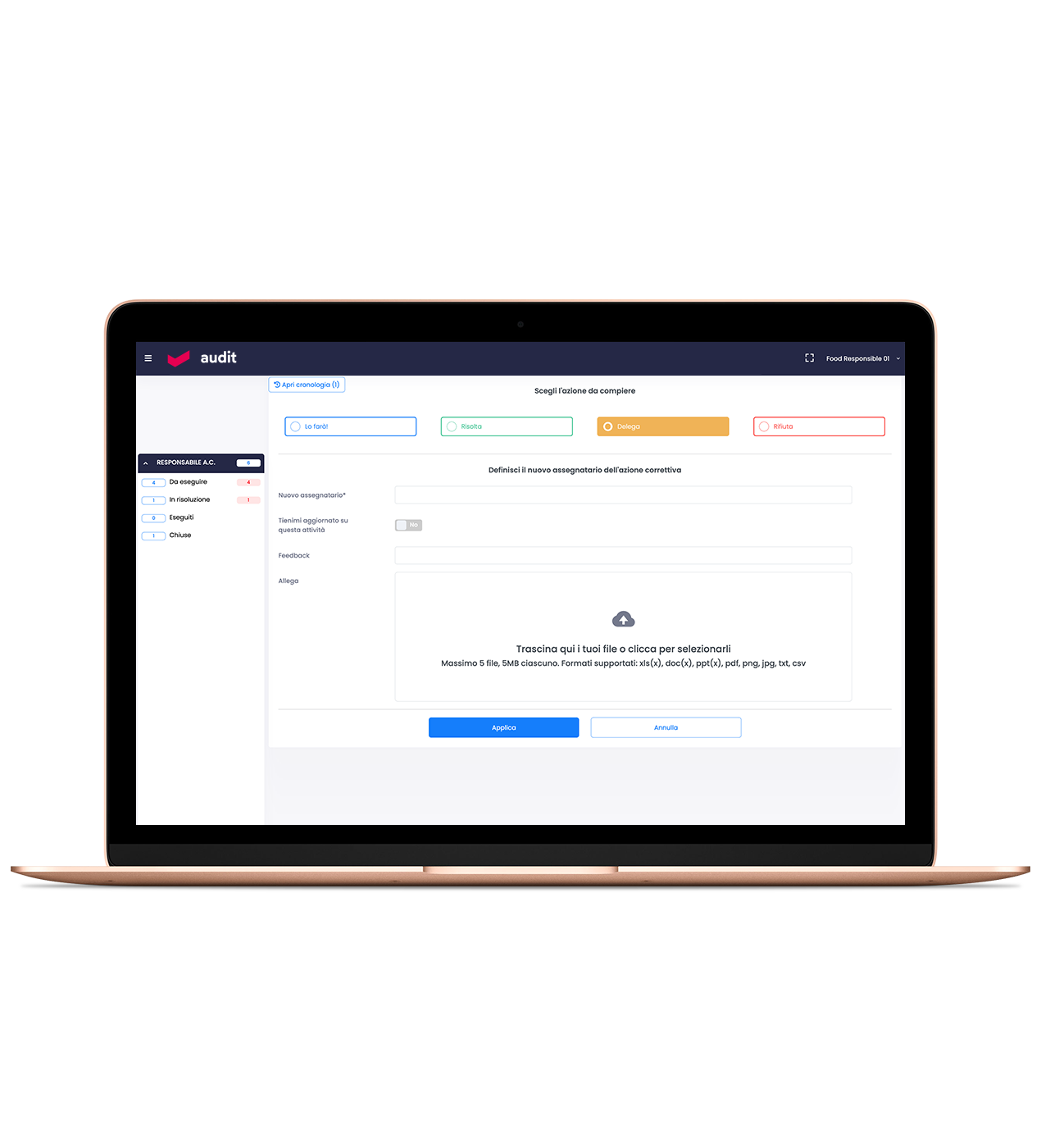 Audit infine consente all’amministratore di decidere se il responsabile dell’azione correttiva può delegare l’azione correttiva ad un altro soggetto.