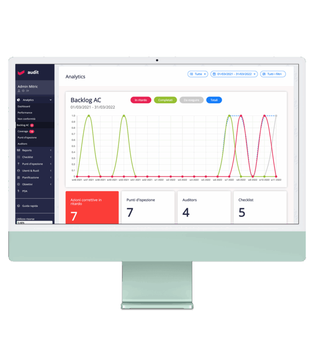 Audit consente all’amministratore di visualizzare kpi sullo stato di avanzamento delle azioni in corso e la distribuzione delle azioni correttive per causa radice.