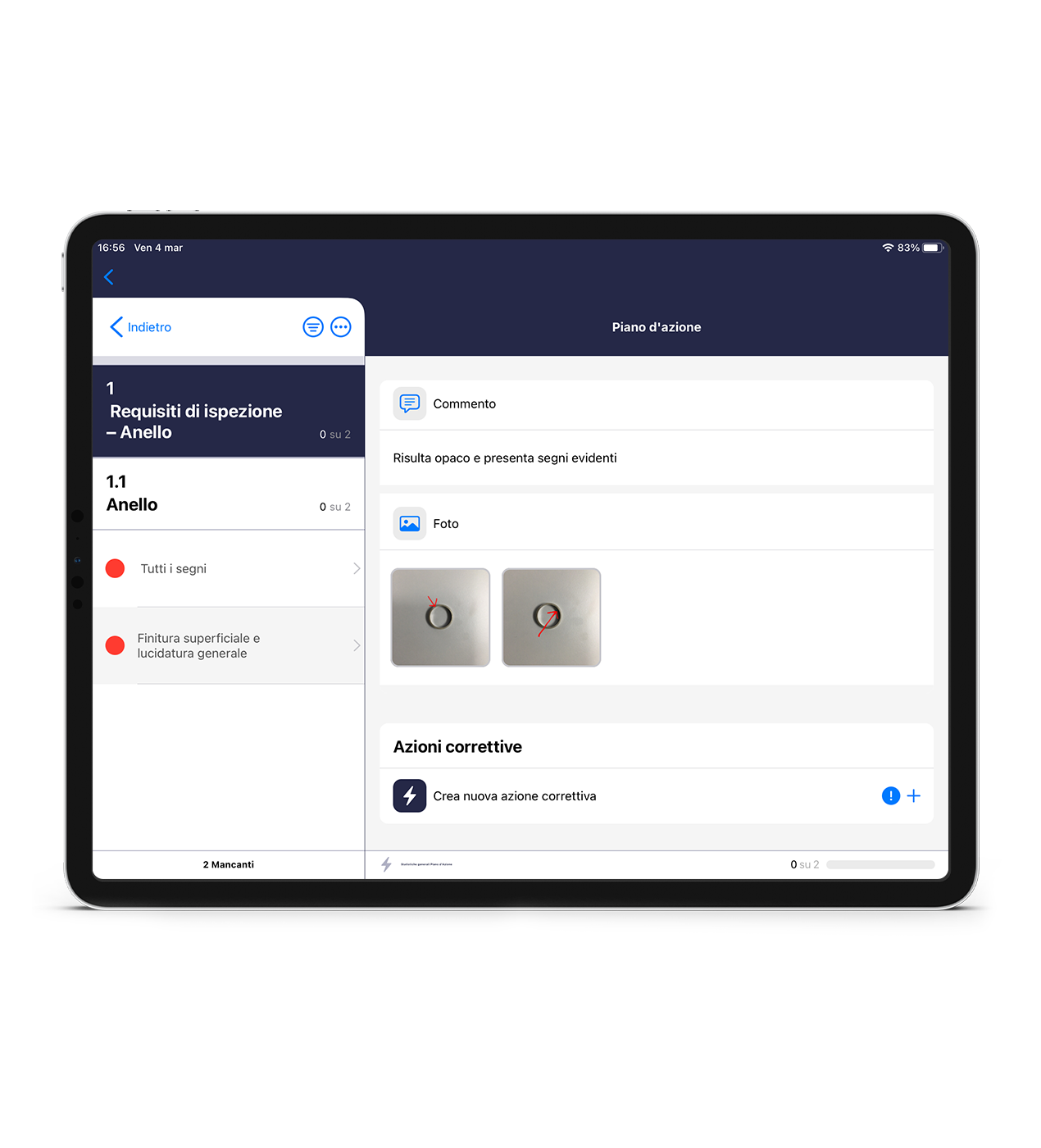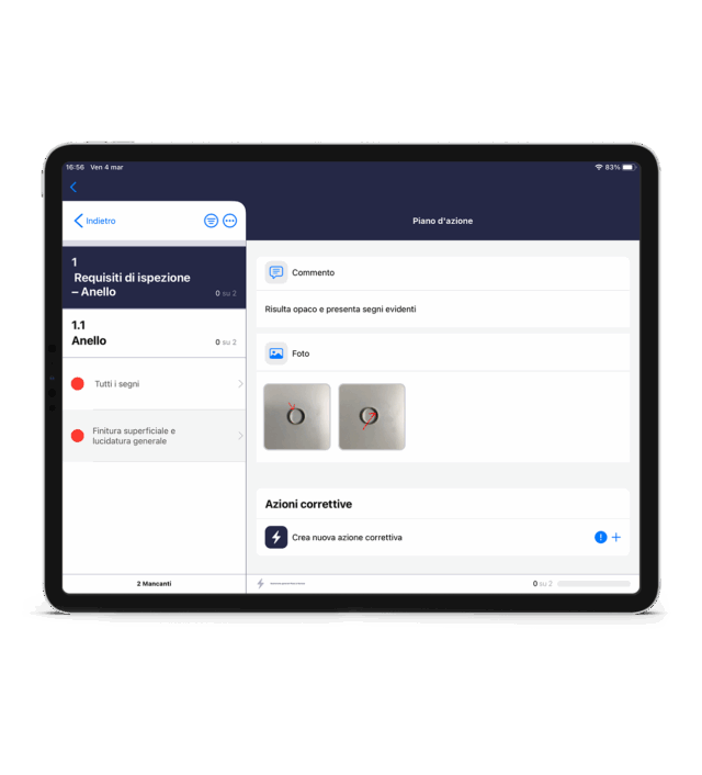 KPI sull’avanzamento delle azioni correttive collegate alle segnalazioni filtrabili per tipologia di segnalazione, punto di ispezione, area, auditor e date. filtri ad hoc per prodotto/componente e difetti nel caso sia attivo il modulo di QMS