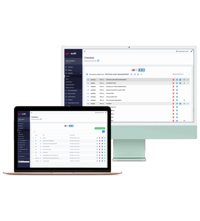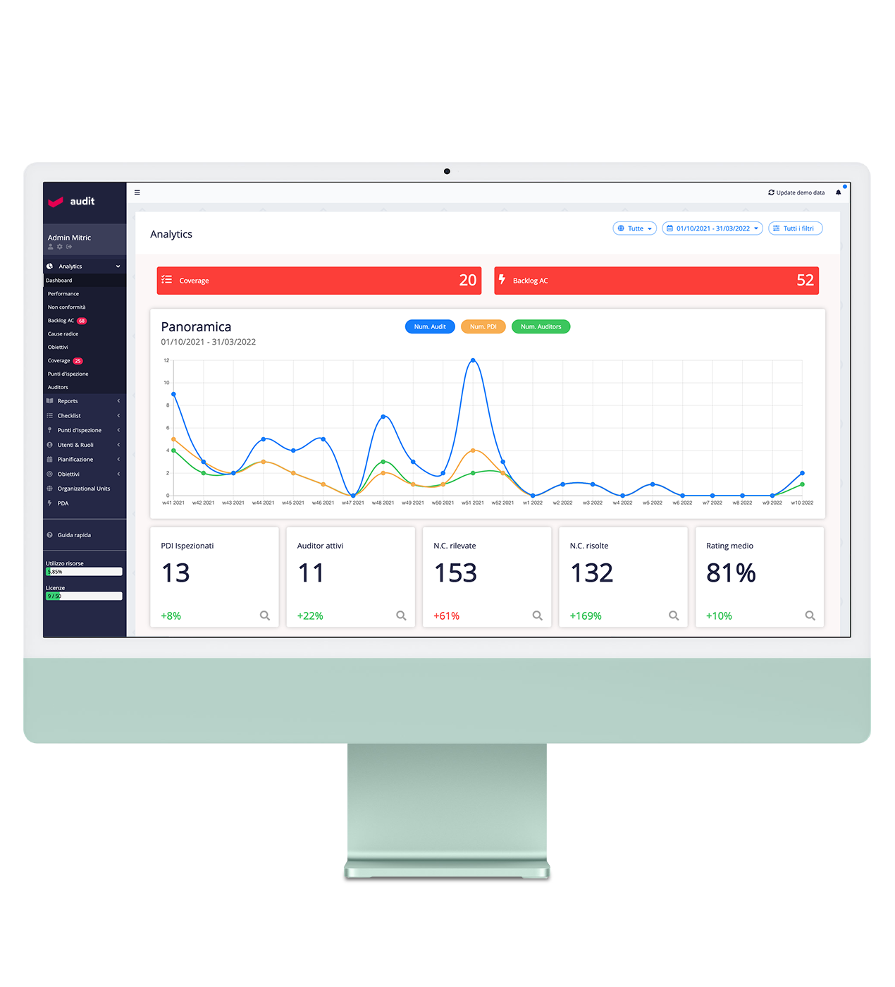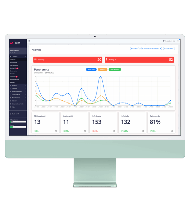 Audit è una soluzione software, disponibile anche su mobile, semplice da usare e modulare che permette di gestire qualsiasi processo tipo di audit HSE e QHSE, contribuendo a migliorare i risultati registrati sul campo (+13%) e l’efficienza (+30%) rispetto alle normali soluzioni basate su excel e carta